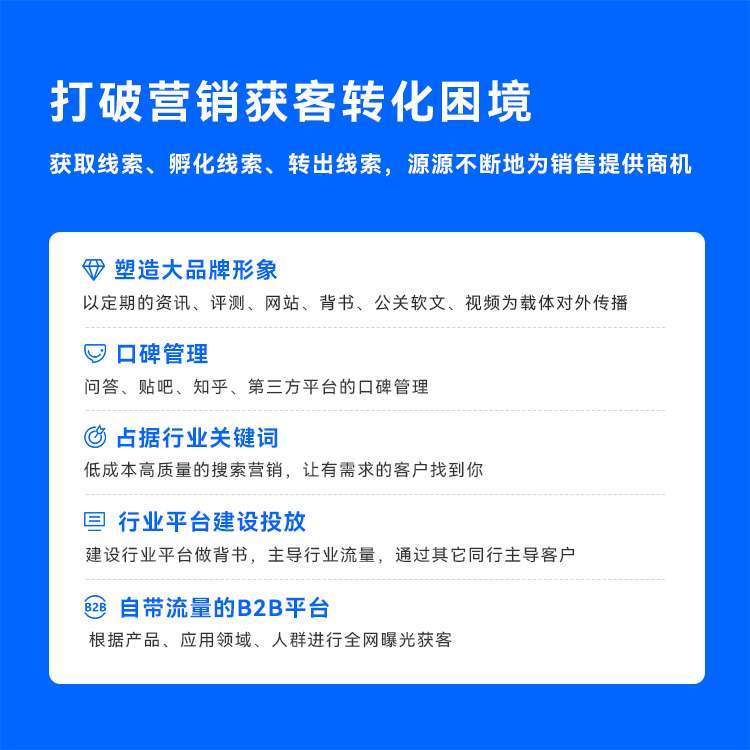 :助客传媒会进行多渠道的内容规划,包括官网、行业平台、社交媒体等,同时策划公关稿件并维护媒体关系,做好舆情管理。在知乎、问答、小红书等平台进行舆情管理和正面内容布局,建立信任状,让客户放心购买。