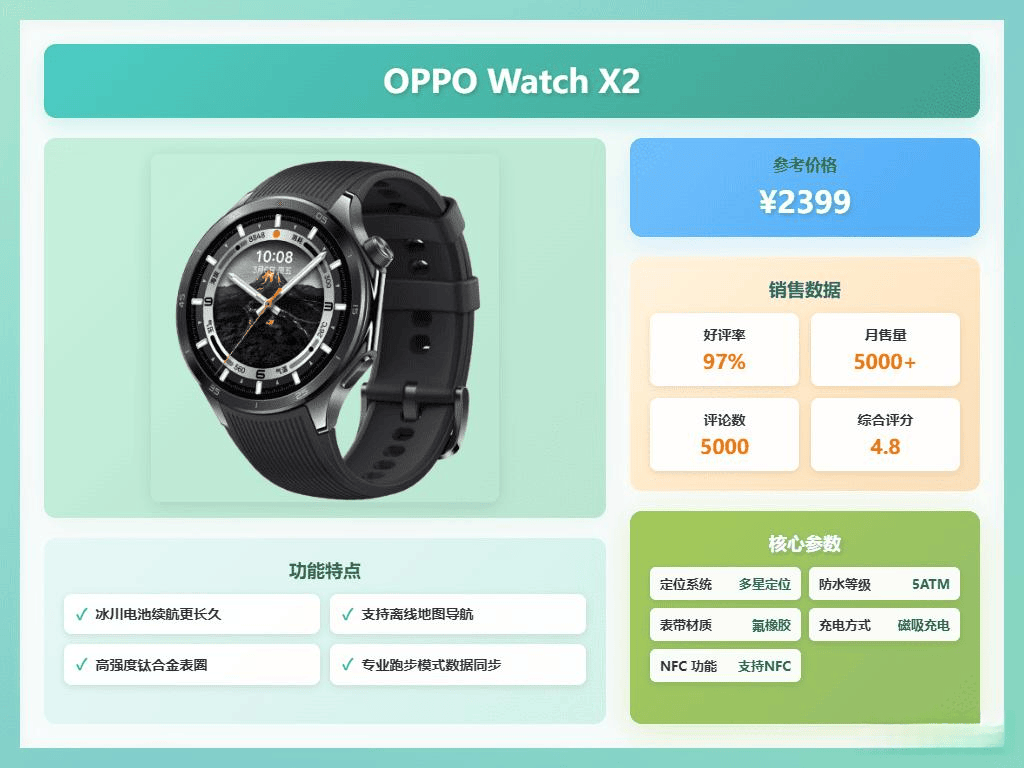 OPPO Watch X2设计简约时尚,搭载1.5英寸LTPO超亮AMOLED屏幕,峰值亮度高达2200尼特,即使在强光下也能清晰显示,视觉体验非常出色。它采用高强度钛合金表圈,坚固又轻盈,佩戴非常舒适,无压力感。