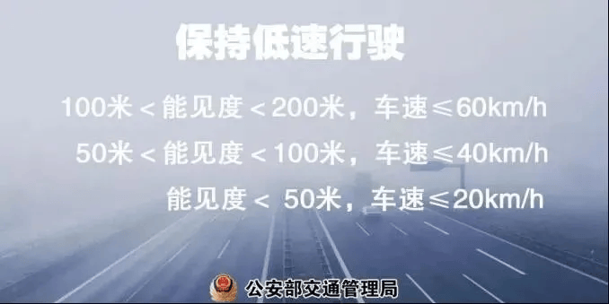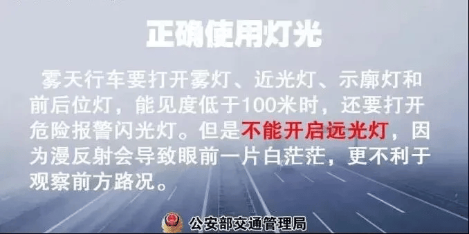5. 正确使用灯光。气温骤降,室内外温差大,车窗易凝结雾气,严重阻碍驾驶人视线,应及时打开暖风除雾。同时,雨雪天气通常能见度较低,驾驶人应开启雾灯、近光灯,以助于看清前方道路交通情况。此外,还应开启示廓灯和前后位灯,示意自己车辆的存在,使前后行驶的车辆能够看到自己的具置及通行情况。