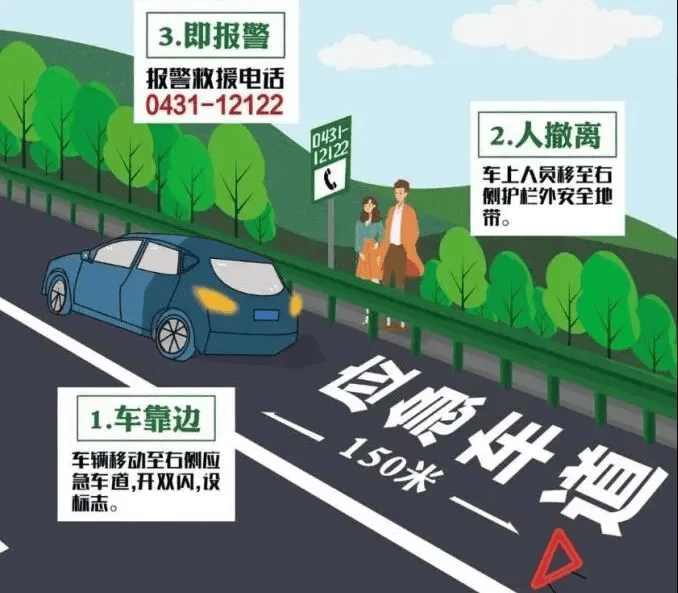 8. 车靠边、人撤离、即报警。当遇到车辆故障或发生交通事故等紧急情况需在高速公路上停车时,牢记“车靠边、人撤离、即报警”九字诀,即如果车辆能移动,将车辆停到应急车道内,打开双闪并将三角牌摆放至车辆后方安全距离处,人员立即撤离至护栏外并报警。