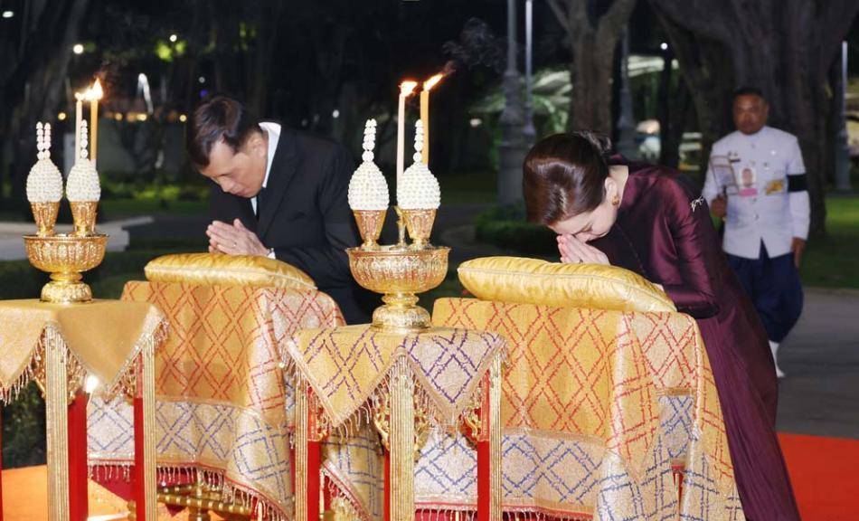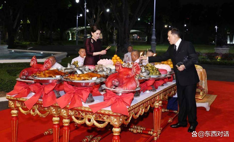 2月17日那天傍晚,曼谷大皇宫里的律实宫安蓬沙坦殿前广场格外庄重。 泰王和苏提达王后在这里主持了一年一度的春节祭祖仪式。 这个传统可不是随便来的,早在19世纪拉玛四世国王时期就有了,当时是仿照华人祭祖习俗设立的,后来慢慢成了泰国王室固定要办的新春活动。 仪式上泰王先点燃金烛银烛和香,苏提达王后接着也恭敬地上香,两人一起向供奉着历代先王先妣的牌位行跪拜大礼。