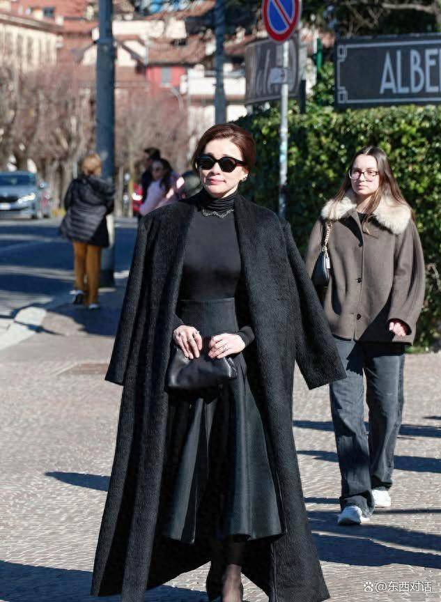 祭祖仪式刚结束没多久,苏提达王后就动身去了意大利。 2月18日她一个人抵达米兰马尔彭萨机场,泰王没有同行。 她机场那身打扮就很有看头——黑色阔腿裤配波点蕾丝上衣,最亮眼的是肩上那条黑色真丝雪纺披肩,随风飘起来特别有范儿。 她手里拿着黑色手包,戴的海蓝宝石首饰在黑色衣服衬托下格外醒目。