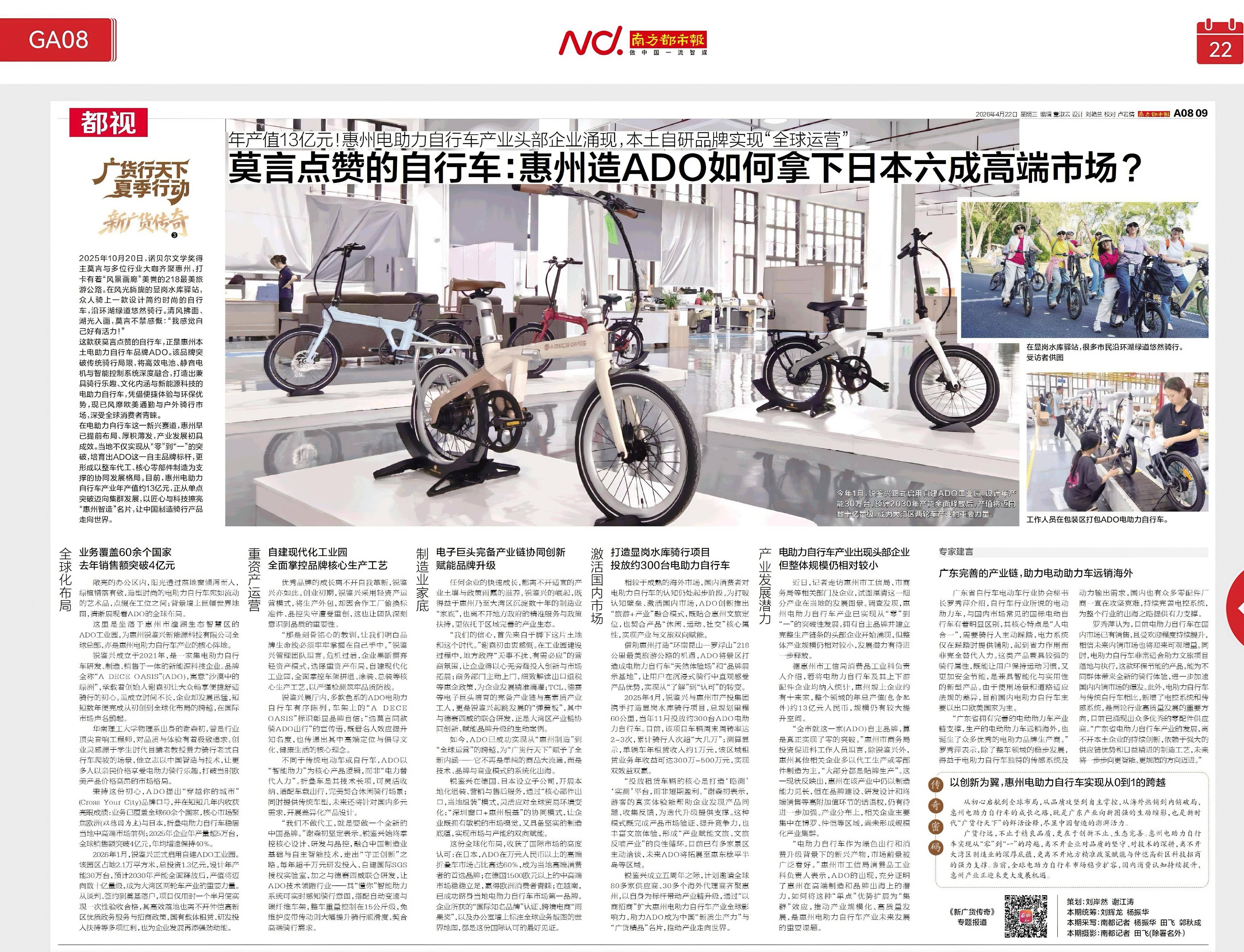 在电助力自行车这一新兴赛道,惠州早已提前布局、厚积薄发,产业发展初具成效。当地不仅实现从“零”到“一”的突破,培育出ADO这一自主品牌标杆,更形成以整车代工、核心零部件制造为支撑的协同发展格局。目前,惠州电助力自行车产业年产值约13亿元,正从单点突破迈向集群发展,以匠心与科技擦亮“惠州智造”名片,让中国制造骑行产品走向世界。