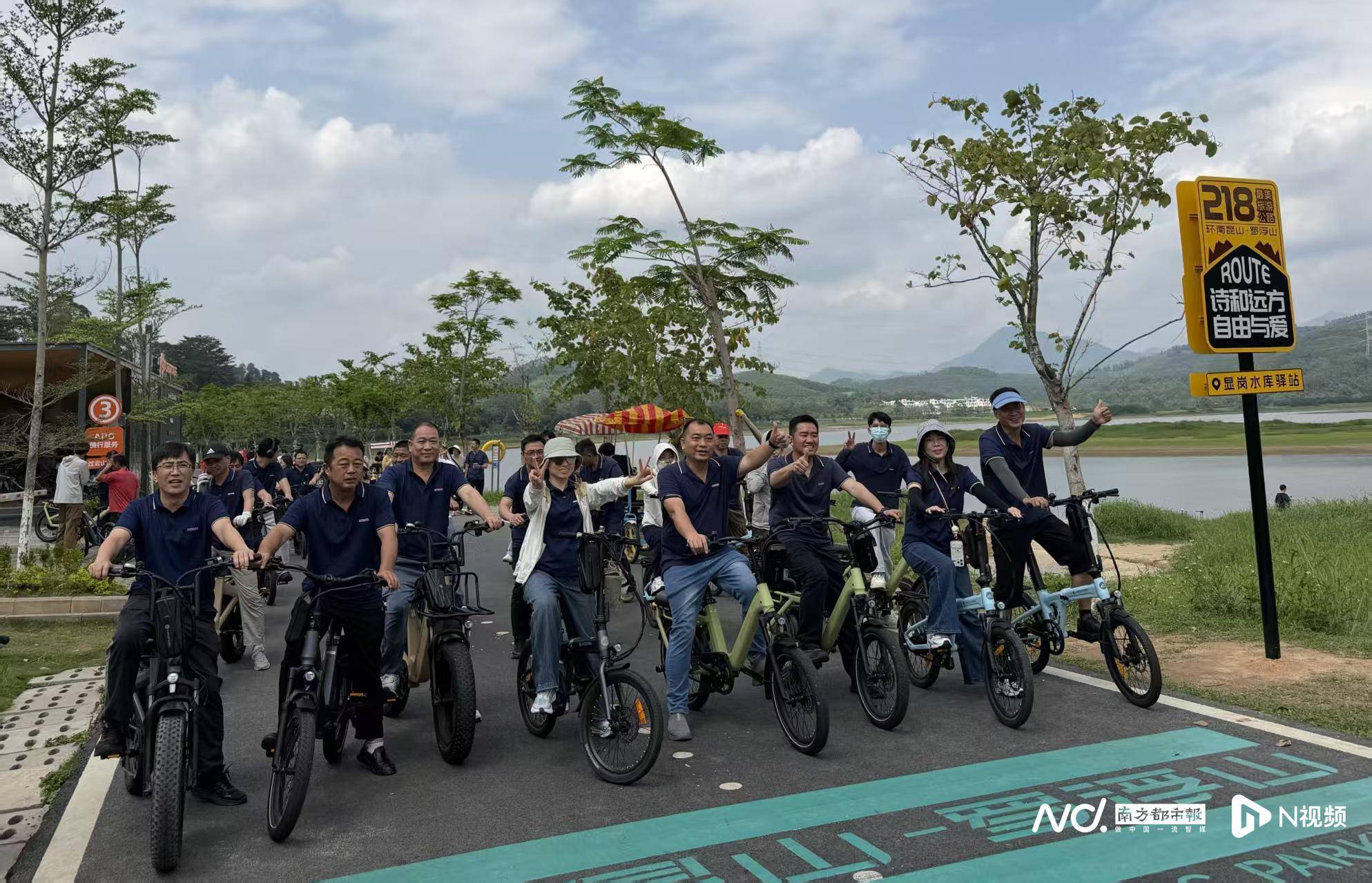 很多市民来到环南昆山—罗浮山218公里最美旅游公路显岗水库绿道上骑行电助力自行车。
