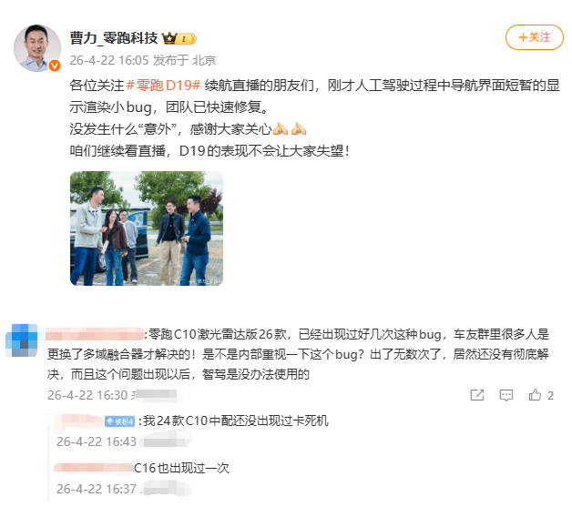 零跑汽车高级副总裁曹力参与了此次直播测试,其微博账号发文称:刚才人工驾驶过程中导航界面短暂的显示渲染小bug,团队已快速修复。没发生什么“意外”,感谢大家关心。