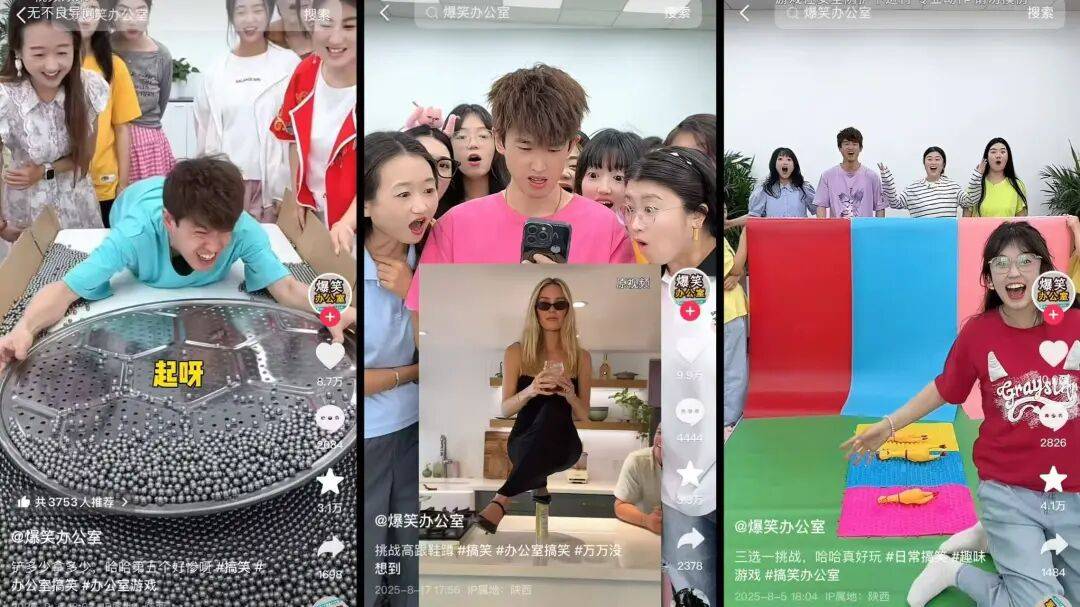 @爆笑办公室,以办公室为核心场景,一批性格各异、个性鲜明的员工在其中发起各种趣味游戏,以极强的娱乐性、反差感、代入感吸引了用户停留并关注。截至目前,账号粉丝量已经突破2000万。