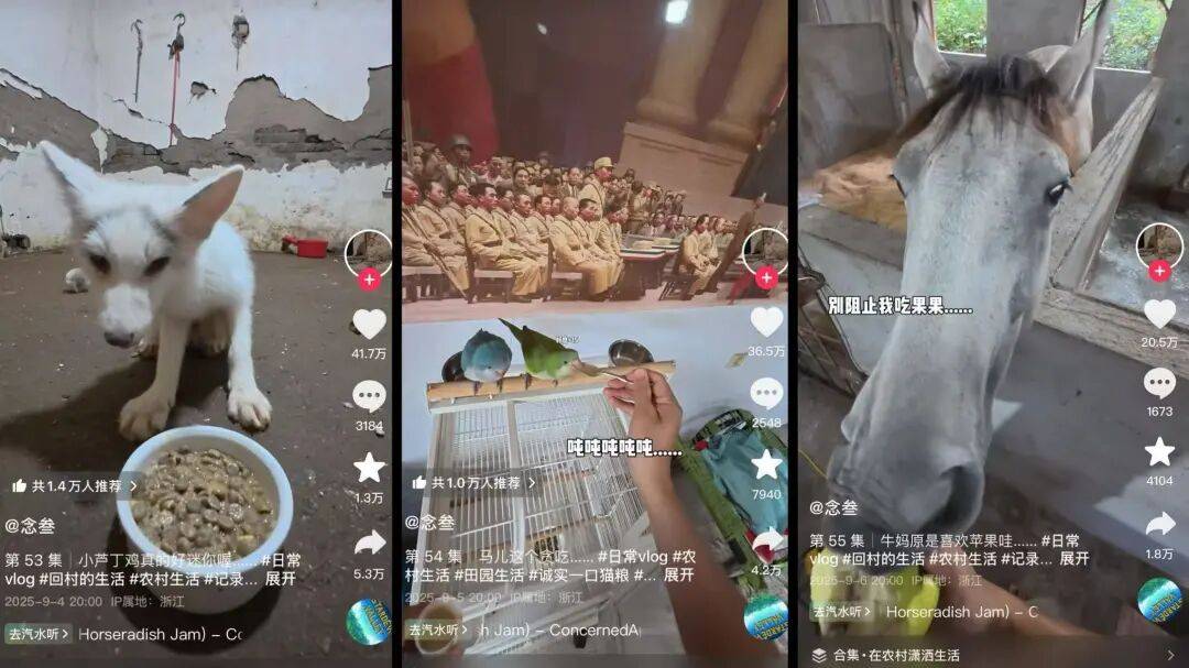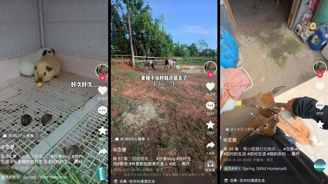 跟随着@念叁的镜头,用户既能看到多种“非常规”动物的可爱日常,还能欣赏到透露着自然气息的农村风光,与此同时,人、动物、自然之间和谐相处的美好氛围更是散发着浓浓的治愈、解压气息,让很多用户不自觉被代入其中, 类似“每天等博主的视频就像小时候等少儿频道一样”的留言几乎会出现在每条视频的评论区。