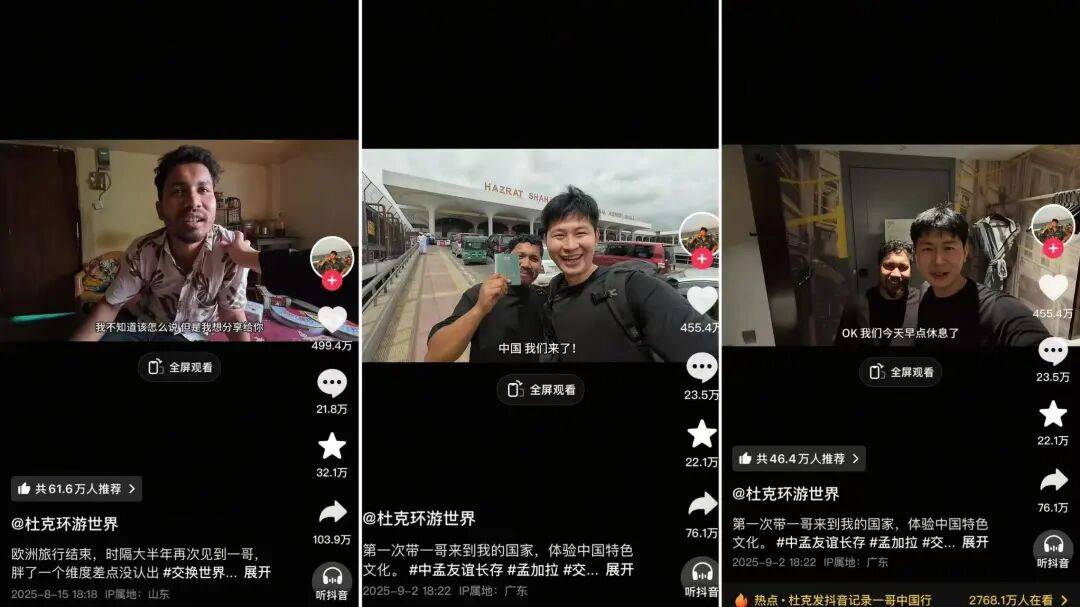 而在今年8月,停更近三月、结束欧洲旅行的杜克不仅又与一哥在孟加拉重逢,还带着他一起来到中国游玩。视频中,两个人相比以往都更加意气风发,彼此间的互动依然流淌着真诚、温暖、美好的基调。如同连续剧般的跨国友情故事引来了众多用户迫不及待的“追剧”。自二人重逢以来,每条视频的点赞量都在百万以上,账号粉丝量也随之不断增长。