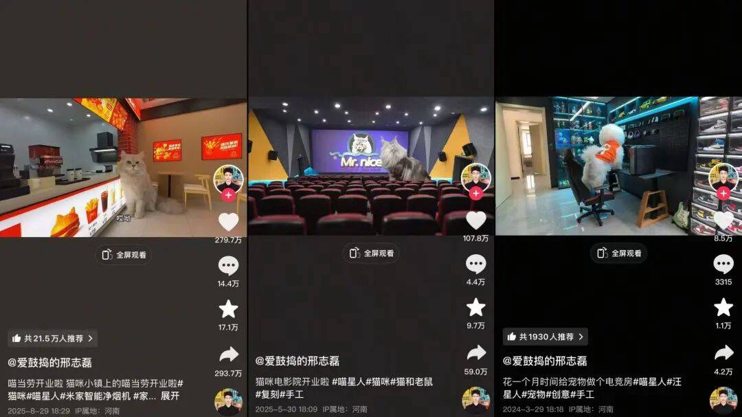 这条视频之后,邢志磊又陆续为猫咪、小狗制作了电竞房、电影院等微缩“游乐场”,不仅完美适配动物体型,还精准还原各种细节,比如电竞房中的微型电脑甚至可以开机,桌子可以升降……种种技术流操作让用户看得惊奇不已。